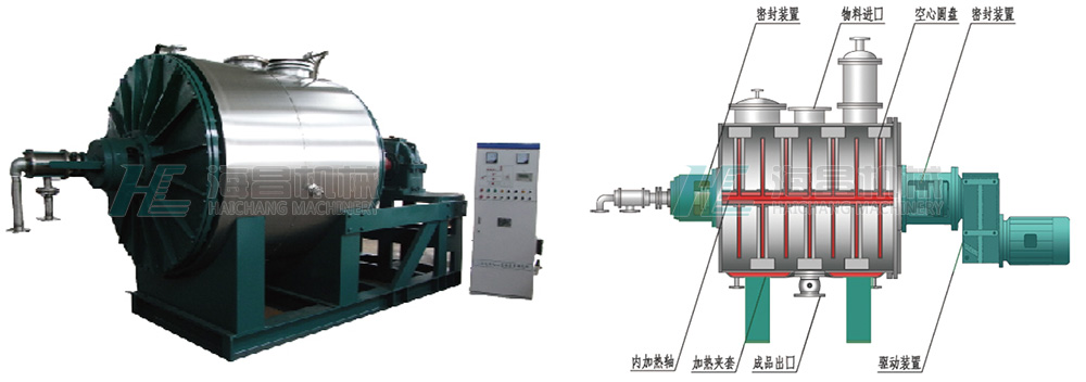 2、除簡體夾套加熱以外,圓盤(或螺帶)也對物料進行加熱,加熱面積是同樣容積的雙錐回轉(zhuǎn)真空干燥機及把式真空干燥機的3~5倍。